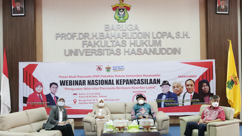 Dalam rangka memperingati Hari Kesaktian Pancasila, Pusat Studi Pancasila Fakultas Hukum Unhas menggelar Webinar Nasional Kepancasilaan dengan Tema "Penguatan Nilai-Nilai Pancasila Berbasis Kearifan Lokal" pada Kamis (17/6) secara daring melalui Zoom dan live dari Baruga Prof. Dr. Baharuddin Lopa, S.H., FH Unhas. Kegiatan ini dibuka secara resmi oleh Dekan Fakultas Hukum Unhas Prof. Dr. Farida Patittingi, S.H., M.Hum. yang didahului sambutan oleh Ketua Pusat Studi Pancasila FH Unhas Prof. Dr. Irwansyah, S.H., M.H.